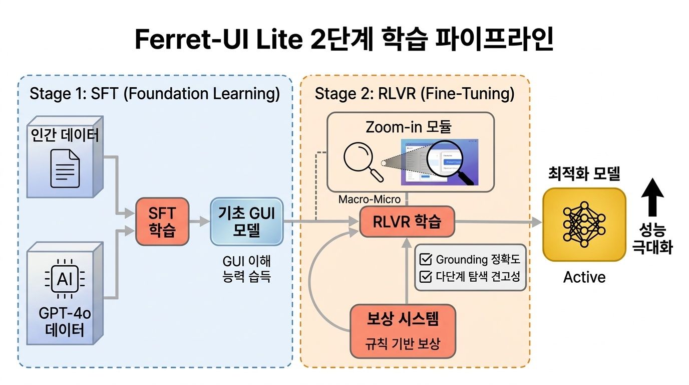 Ferret-UI Lite는 Apple의 Ferret 연구 계보 위에 있습니다. 2023년의 FERRET(시각적 grounding), 2024년의 Ferret-UI(모바일 UI 이해, ECCV 2024), Ferret-UI 2(다중 플랫폼 UI 이해)를 거쳐, Ferret-UI Lite는 '이해'에서 '행동'으로의 도약을 이뤘습니다. 동시에, SeeClick(2024), CogAgent(2024), ShowUI(2025, CVPR 2025), UI-TARS(2025) 등 GUI 에이전트 연구의 급성장 흐름 속에 있으며, 특히 RLVR을 GUI 에이전트에 적용한 선구적 사례로 자리잡고 있습니다.