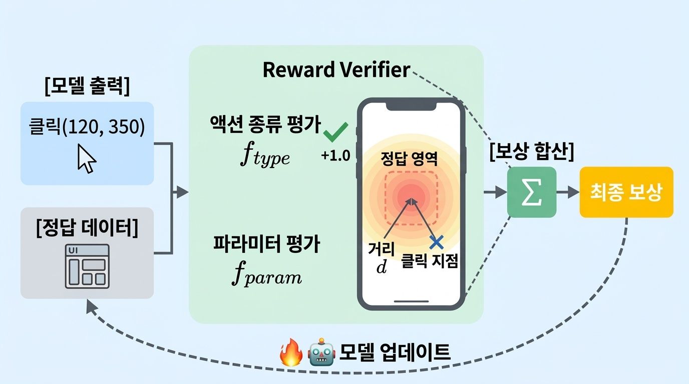 RLVR 단계에서는 모델의 출력을 정답과 비교하여 자동으로 계산되는 검증 가능한 보상 체계를 사용합니다. 보상은 크게 올바른 액션 종류를 선택했는지를 평가하는 f_type과, 클릭 좌표 등의 파라미터가 얼마나 정확한지를 평가하는 f_param으로 나뉩니다. 특히 위치 기반 액션의 경우, 정답 영역과의 거리에 따라 점진적인 점수를 부여하는 Dense Reward 설계를 통해 모델이 더 정밀하게 UI 요소를 타겟팅하도록 유도합니다. 이러한 보상 설계는 소형 모델이 복잡한 UI 환경에서도 높은 성공률을 기록하게 하는 핵심 요소입니다.