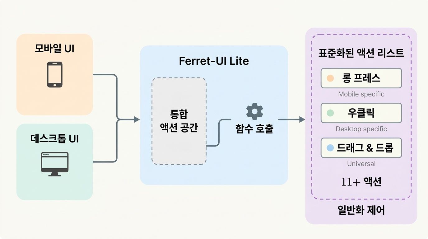 Ferret-UI Lite는 서로 다른 운영체제와 인터페이스를 통합적으로 제어하기 위해 '통합 액션 공간'을 정의합니다. 총 11개 이상의 대표적인 액션을 함수 호출 방식으로 정형화하여, 모델이 프로그래밍 언어의 도구 사용(Tool-use) 능력과 유사하게 GUI를 제어하도록 합니다. 이를 통해 모바일의 'Long Press'나 데스크톱의 'Right Click' 같은 플랫폼 고유의 동작을 하나의 모델 내에서 일관되게 처리할 수 있습니다. 이러한 설계는 모델의 출력 해석력을 높이고 다양한 환경으로의 일반화를 용이하게 합니다.