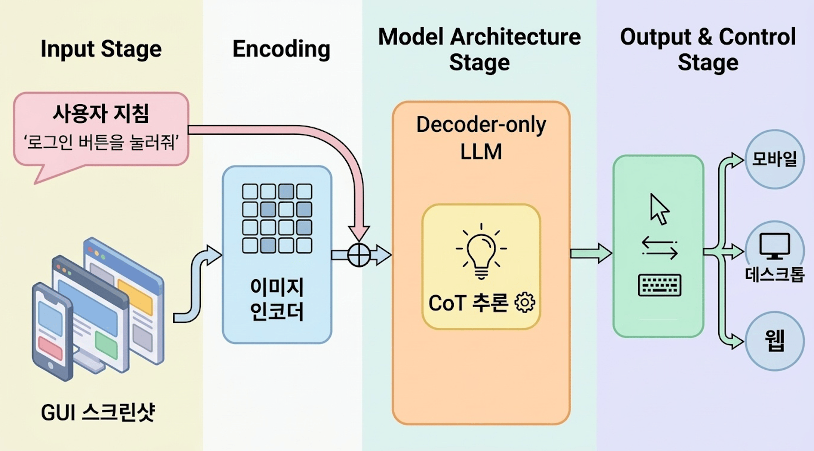 사용자의 현재 화면 스크린샷이 이미지 인코더에 입력됩니다. 이 인코더는 화면 속 버튼, 텍스트, 아이콘 등 UI 요소들을 시각적 특징(visual feature)으로 변환합니다. 마치 사람이 화면을 훑어보며 "여기에 검색창이 있고, 저기에 메뉴 버튼이 있네"라고 파악하는 것과 같습니다. 사용자의 자연어 지시도 함께 입력되어, 모델은 '무엇을 해야 하는지'와 '화면이 어떻게 생겼는지'를 동시에 처리합니다.