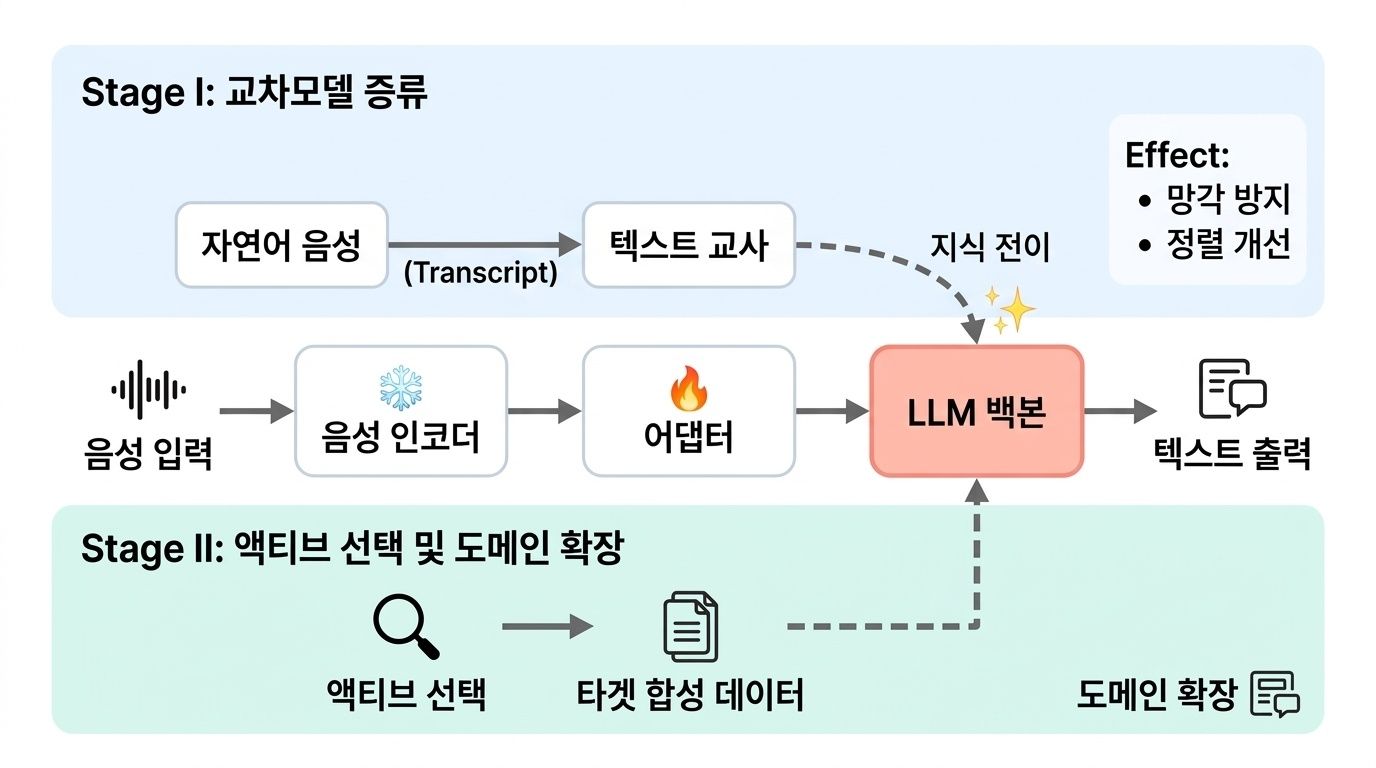 SALAD 전체 파이프라인 — SALAD 모델의 전체 아키텍처와 두 단계 학습(Stage I: 자연어 음성 데이터 기반 Distillation, Stage II: Active Selection을 통한 도메인 확장) 과정을 보여주는 다이어그램을 생성하세요. 음성 인코더, 어댑터, LLM 백본, 그리고 음성 입력이 텍스트 출력으로 변환되는 흐름을 포함해야 합니다.
