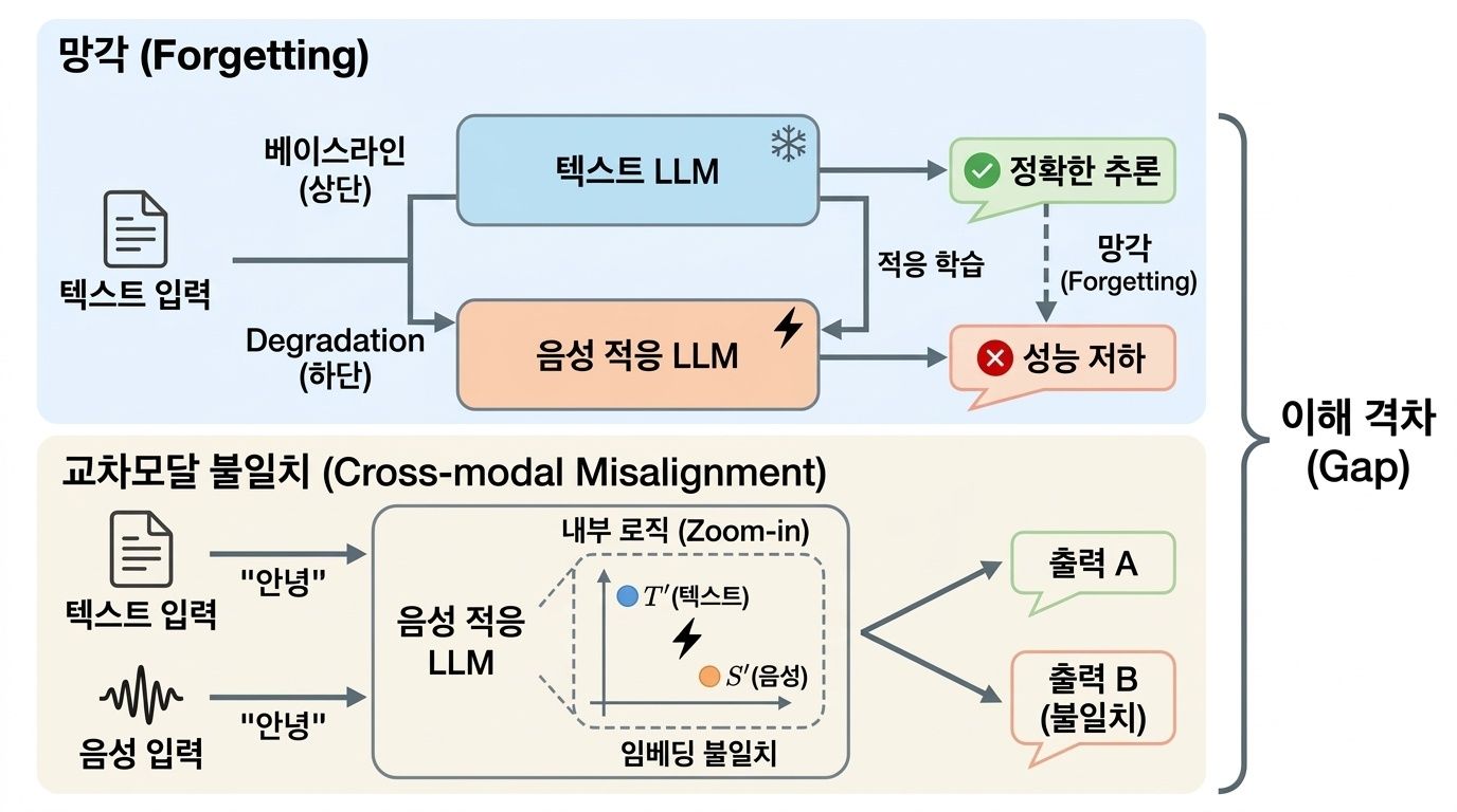 텍스트-음성 이해 격차 개념 — LLM에서 발생하는 'forgetting'(텍스트 기반 LLM의 기존 텍스트 능력 상실)과 'cross-modal misalignment'(의미론적으로 동일한 텍스트 및 음성 입력에 대한 LLM 출력 불일치)를 시각적으로 설명하는 개념 다이어그램을 생성하세요. 이상적인 LLM과 음성 적응형 LLM 간의 성능 차이를 대비하여 보여줄 수 있습니다.