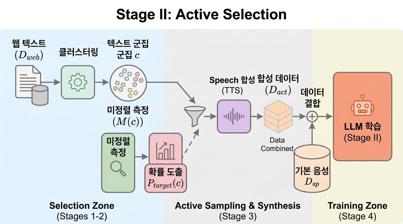 SALAD Active Selection 메커니즘 — SALAD의 Stage II 학습 단계에서 Active Selection을 통해 합성 음성 데이터(Dactive)가 어떻게 선택되는지 상세한 흐름을 보여주는 다이어그램을 생성하세요. 광범위한 텍스트 코퍼스(Dweb)를 클러스터링하고, 각 클러스터의 cross-modal misalignment(M(c))를 계산하며, 이를 기반으로 Ptarget(c)를 도출하여 합성 데이터를 샘플링하고, Dspeech와 결합하는 과정을 포함해야 합니다.