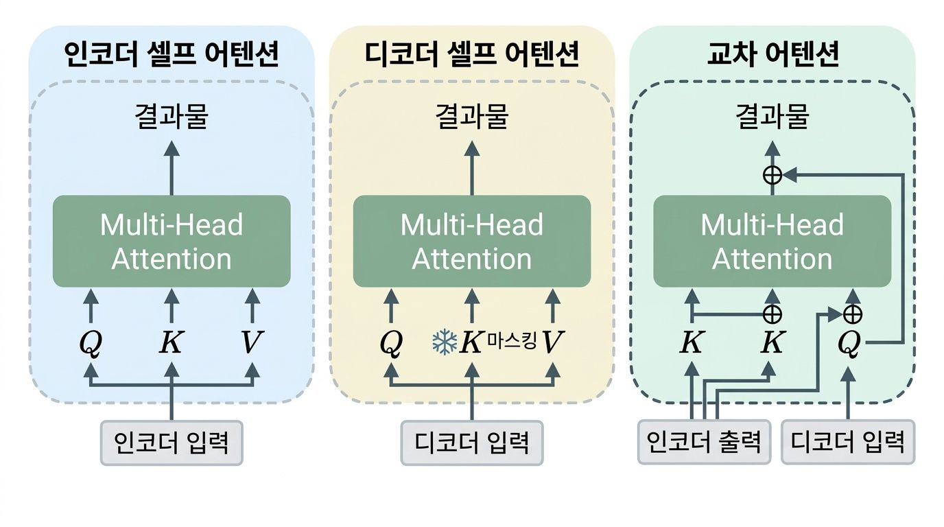 Decoder 레이어는 Encoder보다 하나의 서브레이어가 더 있습니다. 첫째, Masked Self-Attention — 번역문을 생성할 때 아직 생성하지 않은 미래 단어를 보면 안 되므로, 미래 위치에 -∞ 마스크를 씌워 softmax 후 0이 되게 합니다. 둘째, Encoder-Decoder Attention — Decoder의 Q가 Encoder의 K, V를 참조하여 원문 정보를 가져옵니다. 셋째, Feed-Forward Network. 이 구조 덕분에 Decoder는 '지금까지 생성한 번역문'과 '원문 전체'를 동시에 고려하여 다음 단어를 예측합니다.