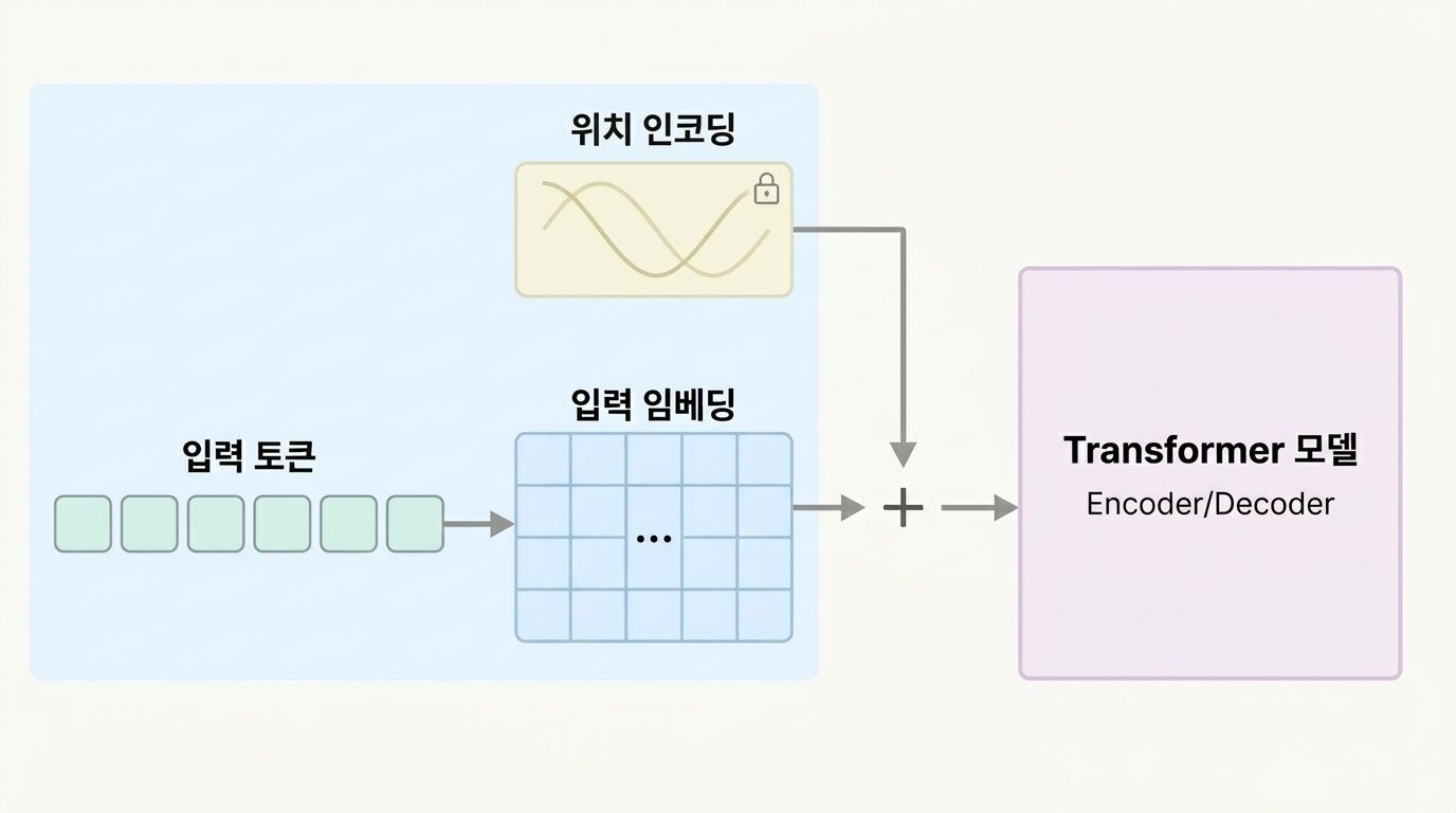 입력 문장의 각 토큰은 먼저 학습 가능한 임베딩을 통해 512차원 벡터로 변환됩니다. 그런데 Transformer는 단어를 동시에 처리하므로 순서 정보가 없습니다. 이를 보완하기 위해 각 위치마다 고유한 사인/코사인 패턴의 Positional Encoding을 생성하여 임베딩 벡터에 더합니다. 마치 원탁 회의에서 이름표만으로는 발언 순서를 모르니, 각 좌석에 번호를 붙이는 것과 같습니다. 임베딩 가중치에는 √d_model을 곱해 위치 인코딩과 스케일을 맞춥니다.