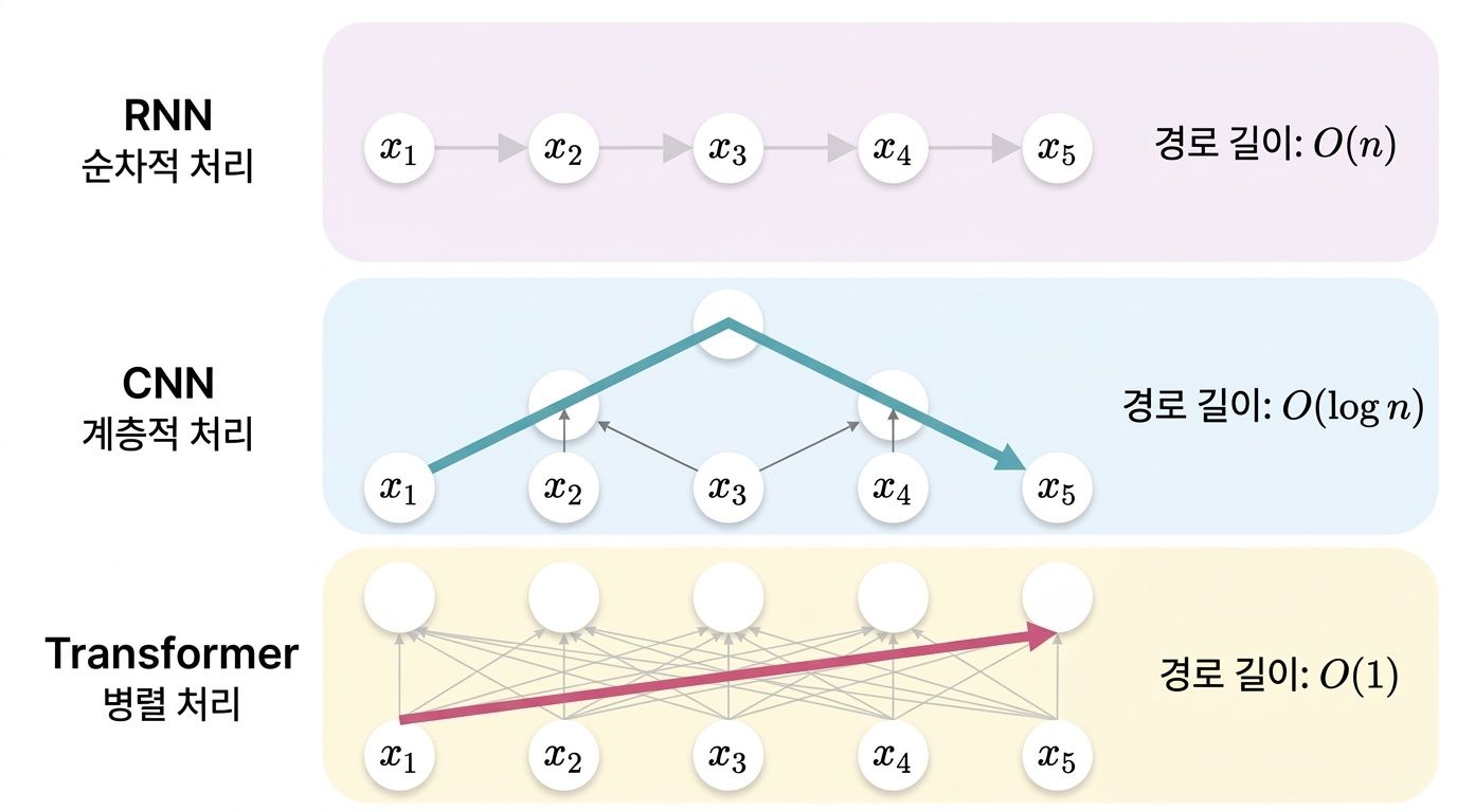 [강점] 장거리 의존성 포착: Self-Attention은 시퀀스 내 임의의 두 위치 사이 경로 길이가 O(1)으로, RNN의 O(n)이나 CNN의 O(log_k(n))보다 월등합니다.
