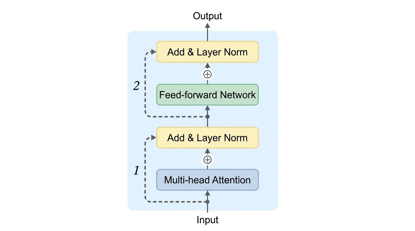 하나의 Encoder 레이어는 두 개의 서브레이어로 구성됩니다: Multi-Head Self-Attention과 Position-wise Feed-Forward Network(FFN). FFN은 각 위치에 독립적으로 적용되는 두 층의 완전연결층(차원: 512→2048→512)으로, ReLU 활성화를 사용합니다. 각 서브레이어는 Residual Connection으로 감싸여 있어 입력이 직접 출력에 더해지고, Layer Normalization이 적용됩니다. 이 레이어를 6개 쌓으면, 낮은 층은 문법적 패턴을, 높은 층은 의미적 관계를 점진적으로 학습합니다.