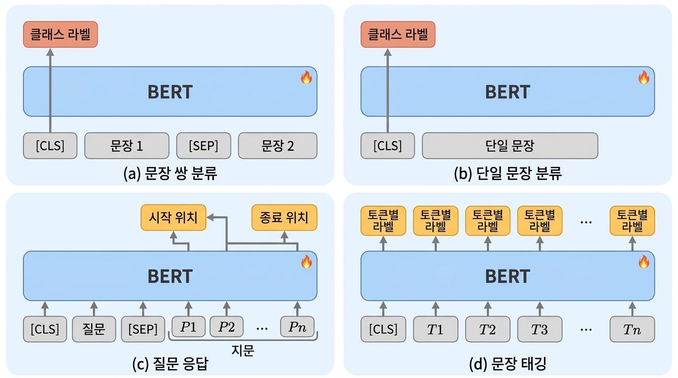 BERT의 또 다른 핵심은 'pre-train & fine-tune' 전략입니다. 위 다이어그램처럼 사전 학습 단계에서 대규모 텍스트로 언어 자체를 이해하게 한 뒤, fine-tuning 단계에서는 출력 레이어만 태스크에 맞게 바꿔서 전체 모델을 미세 조정합니다. 마치 의대에서 기초 의학을 배운 뒤(사전 학습), 전공 과목만 추가로 수련하면(fine-tuning) 외과의도, 내과의도 될 수 있는 것과 같습니다. 모든 전공이 같은 기초 위에 서 있으니, 기초가 탄탄할수록 모든 전공에서 유리합니다.