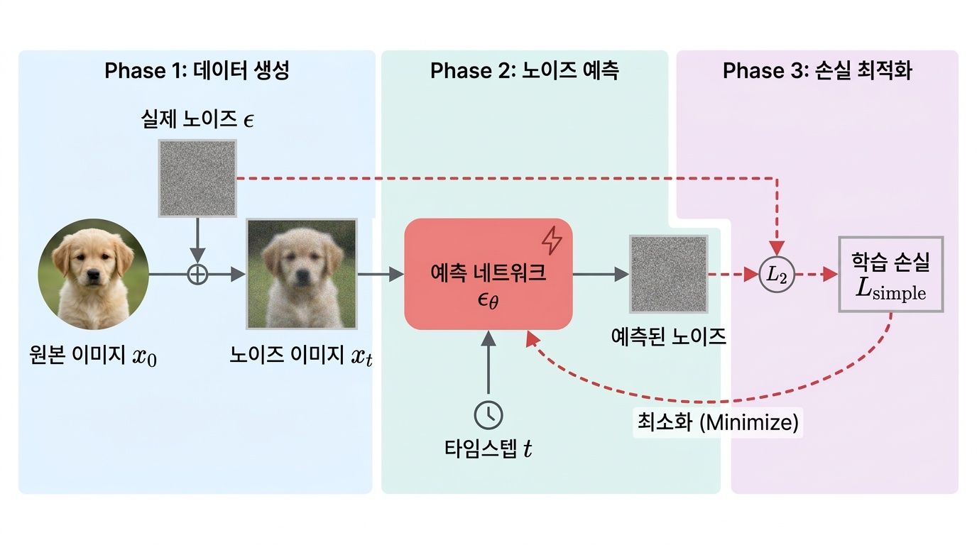 확산 모델의 핵심 학습 목표인 L_simple(θ) = E[||ε - εθ(x_t, t)||²]를 시각적으로 설명합니다. 원본 이미지(x0)에 무작위 노이즈(ε)가 추가되어 중간 상태(x_t)가 되는 과정과, εθ 네트워크가 x_t와 t로부터 노이즈를 예측하고, 이 예측된 노이즈와 실제 노이즈 간의 L2-norm 차이를 최소화하는 과정을 보여줍니다.