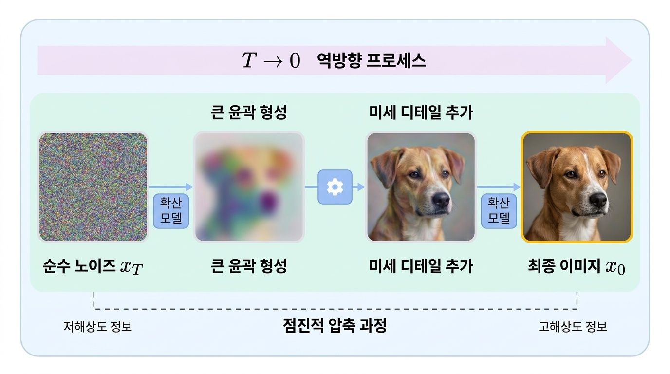확산 모델이 순수 노이즈(xT)에서 출발하여 역방향 프로세스를 통해 이미지를 생성하는 과정을 단계별로 보여줍니다. 초기 단계에서는 이미지의 큰 윤곽(coarse features)이 형성되고, 후기 단계에서는 미세한 디테일(fine details)이 추가되어 최종적으로 고품질 이미지가 완성되는 모습을 시각적으로 강조하며, 점진적 압축(progressive compression)과의 연관성을 설명합니다.